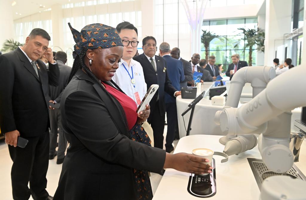 10月29日,駐華使節代表團在中國-東盟國家人工智能應用合作中心參觀體驗機器人制作咖啡。新華社記者 陸波岸 攝