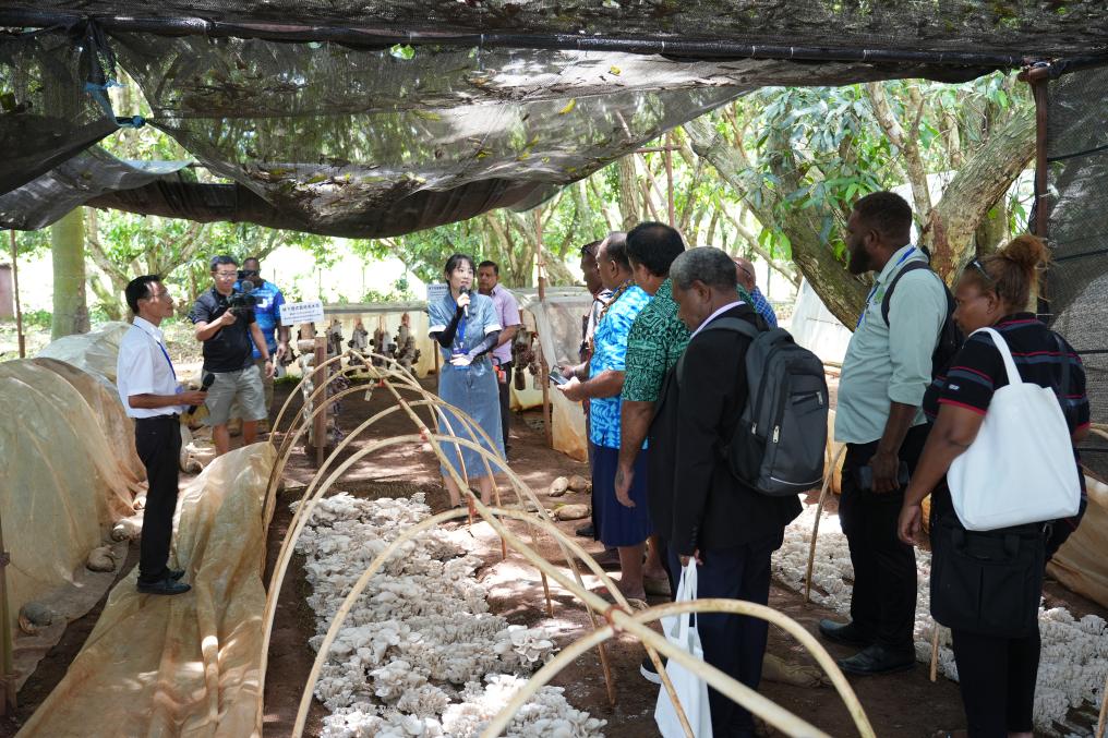 11月19日,在斐濟楠迪中國—太平洋島國菌草技術示范中心,與會代表參觀菌草菇種植示范基地。新華社發(高鑫攝)