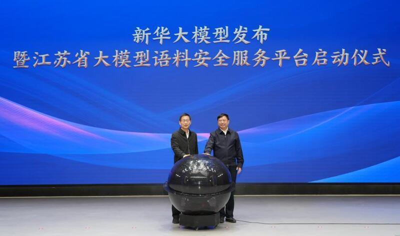 新華報(bào)業(yè)傳媒集團(tuán)董事長雙傳學(xué)(右)、江蘇省委網(wǎng)信辦副主任趙明(左)共同啟動(dòng)發(fā)布新華大模型暨江蘇省大模型語料安全服務(wù)平臺(tái)