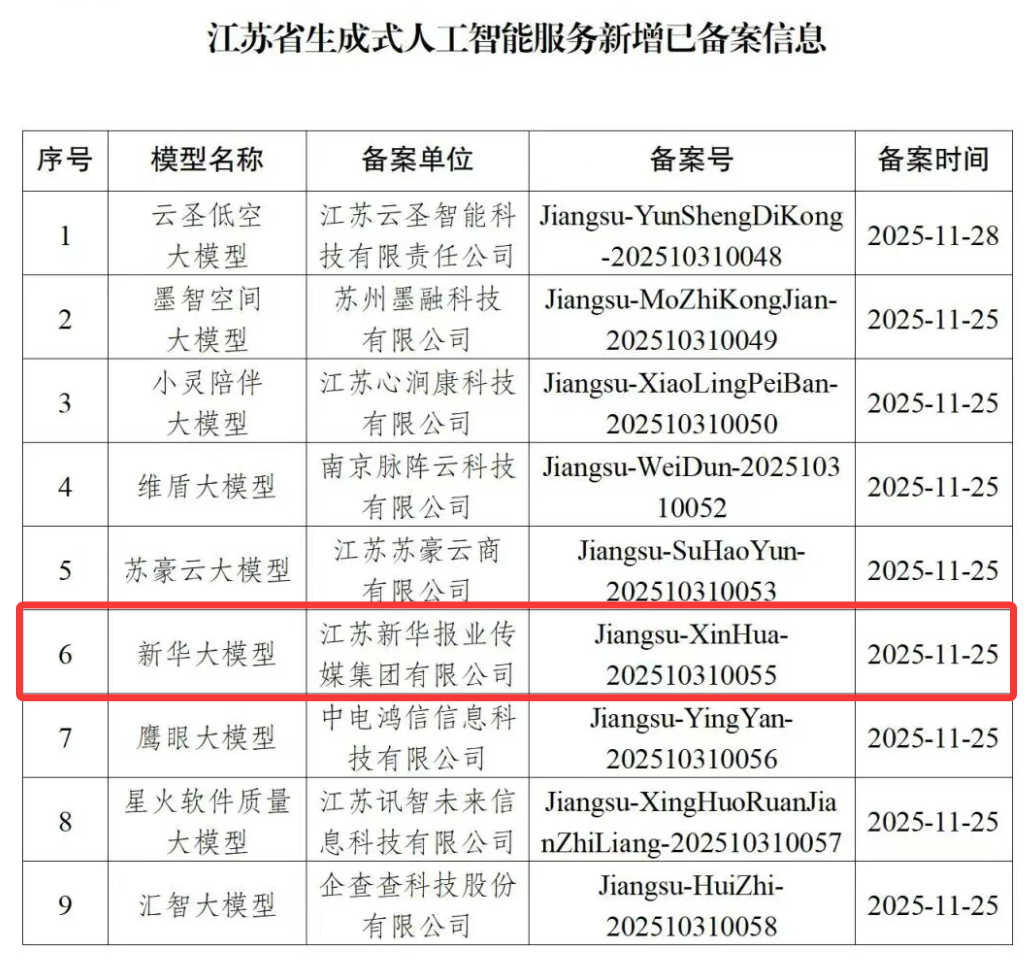 記者從江蘇省委網(wǎng)信辦獲悉,截至2025年12月2日,江蘇新增新華大模型等9款已完成備案的生成式人工智能服務(wù)。
